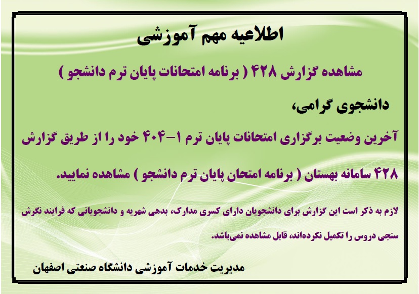 اطلاعیه آخرین وضعیت برگزاری امتحانات پایان ترم 1-404 فایل پیوست اندازه اطلاعیه آخرین وضعیت برگزاری امتحانات پایان ترم 1-404.pdf 337.89 کیلوبایت