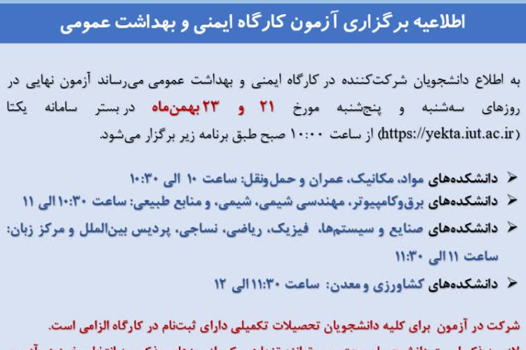 زمان برگزاري آزمون كارگاه ايمني و بهداشت عمومي