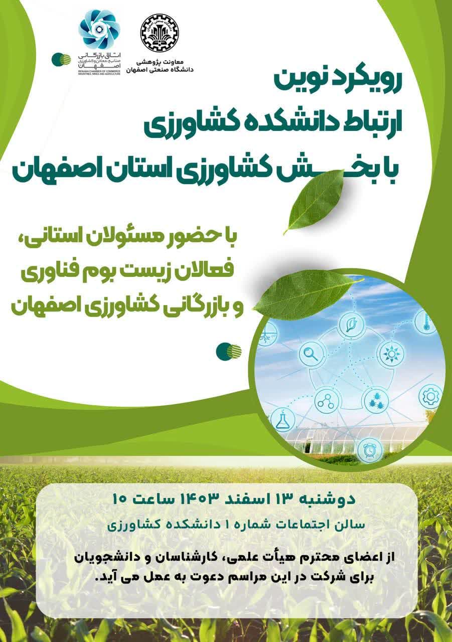 دکتر صفوی معاون پژوهشی دانشگاه صنعتی اصفهان ضمن تایید گزارش ریاست محترم دانشکده کشاورزی گفتند با توجه به وضعیت بحرانی که در حوزه آب و هوا و انرژی داریم هیچ فرصت دیگری برای آزمون و خطا نداریم و باید هرچه زودتر از پتانسیلهای دانشکده کشاورزی برای غلبه بر مشکلات بخشهای مختلف این حوزه استفاده شود. ایشان افزودند. دانشگاه صنعتی اصفهان برای اولین بار در کشور در نظر دارد با راه اندازی دفتر ارتباط با صنعت تخصصی کشاورزی در این مسیر گام بردارد و بر اساس بازخورد آن چنین دفاتری را در سایر دانشکده های این دانشگاه احداث کند.