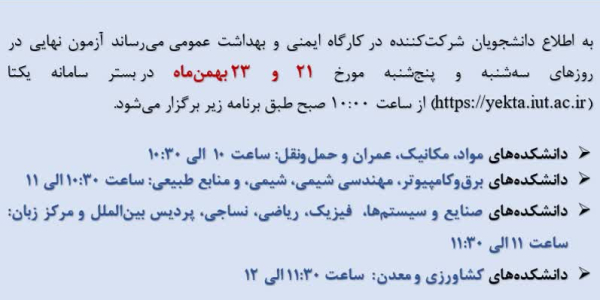 زمان برگزاري آزمون كارگاه ايمني و بهداشت عمومي